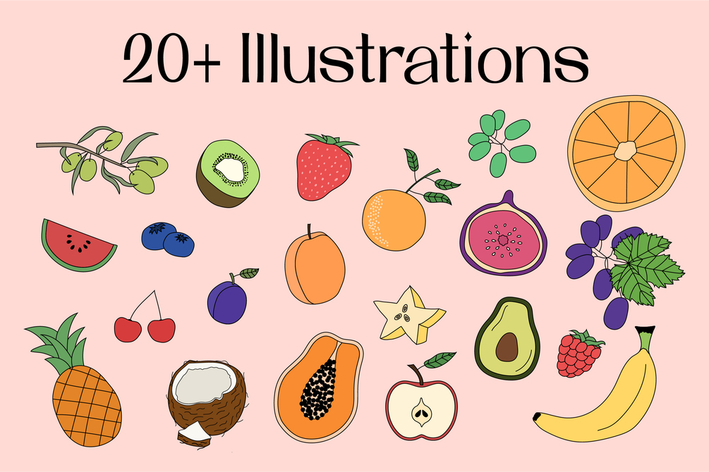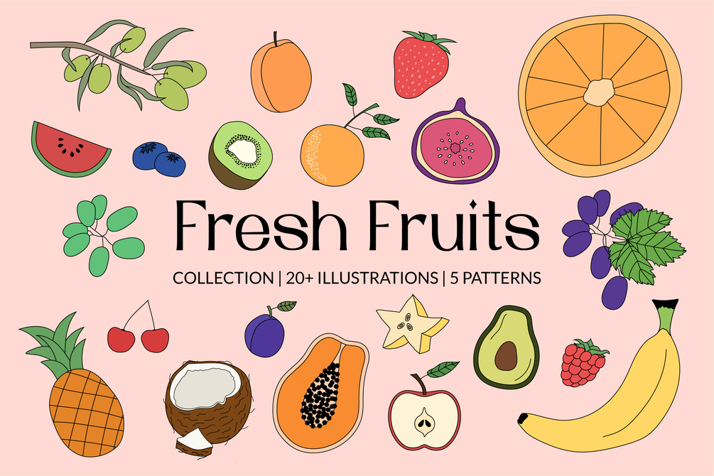 Introducing our "Fresh Fruits Graphics Collection," a vibrant assortment of delightful illustrations and patterns inspired by nature's bounty. Immerse yourself in a visually appealing array of meticulously crafted fruit-themed graphics, featuring an assortment of juicy, succulent fruits that burst with color and life.